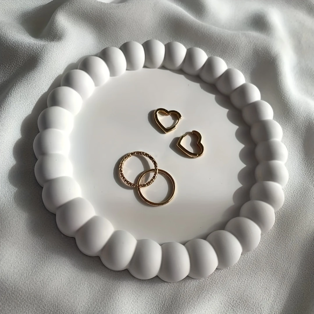 Add a touch of playful sophistication to your décor with our Bubbled Bliss Ceramic Tray. This charming piece, crafted from smooth white ceramic, features a delightful perimeter of rounded “bubbles,” creating a unique and tactile design. Ideal for organizing small essentials like jewelry and keys, serving petite treats, or simply as an eye-catching decorative accent.